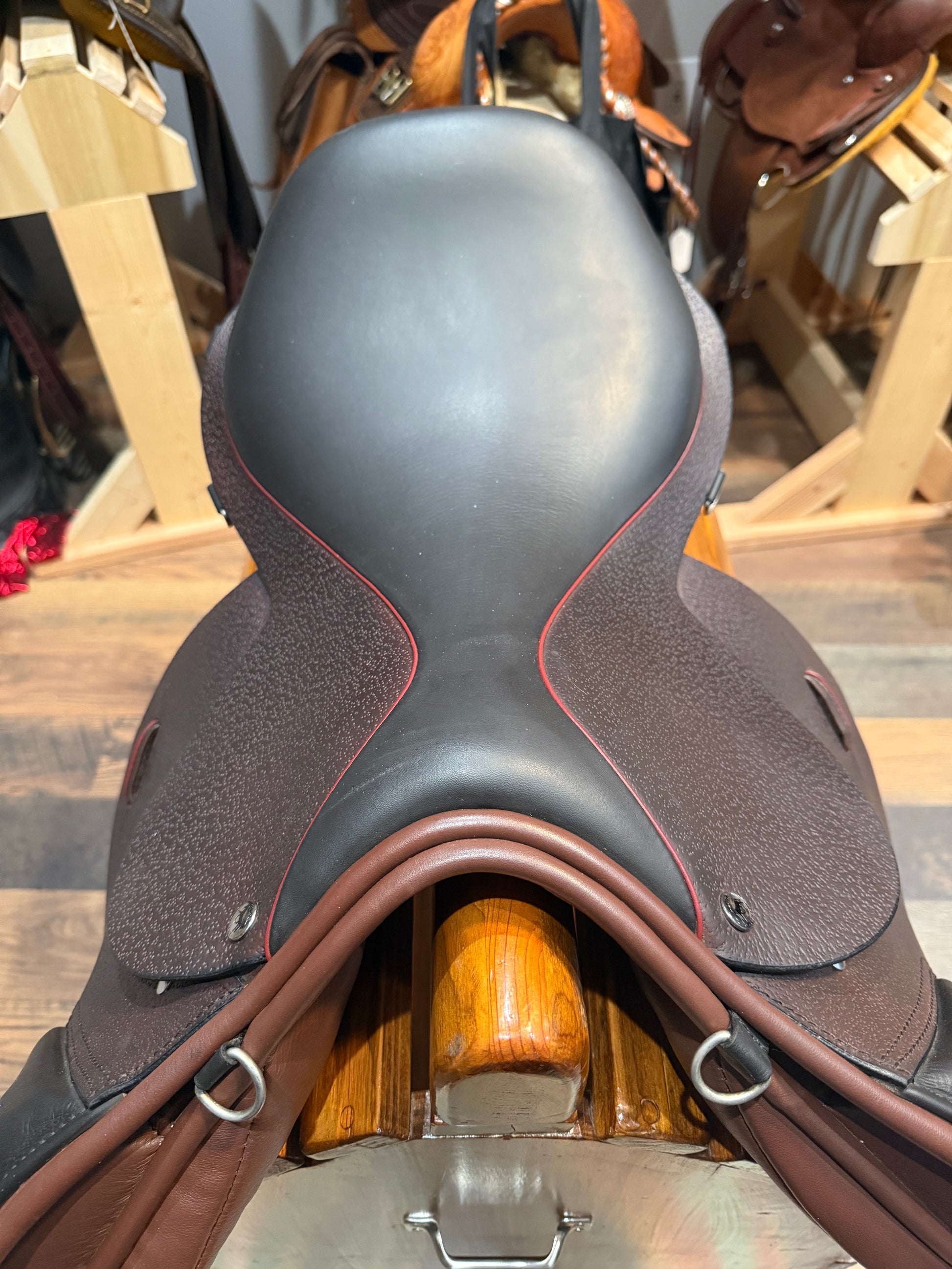 It has a low profile square cantled seat and an aesthetic continental close-contact look – so sought after in the jumping world especially with the Hunter-Jumpers.
