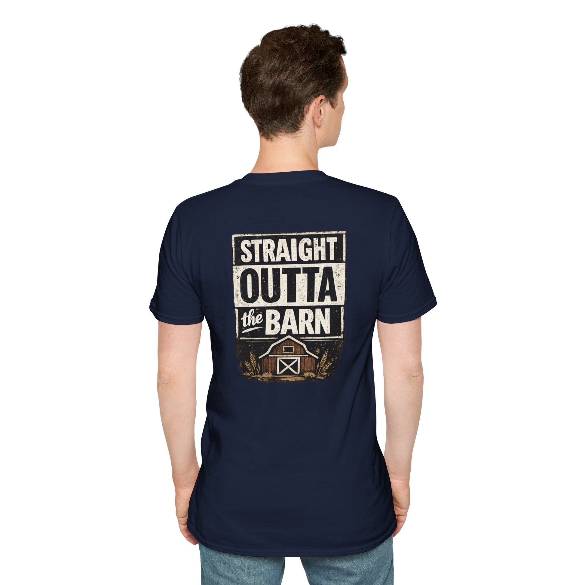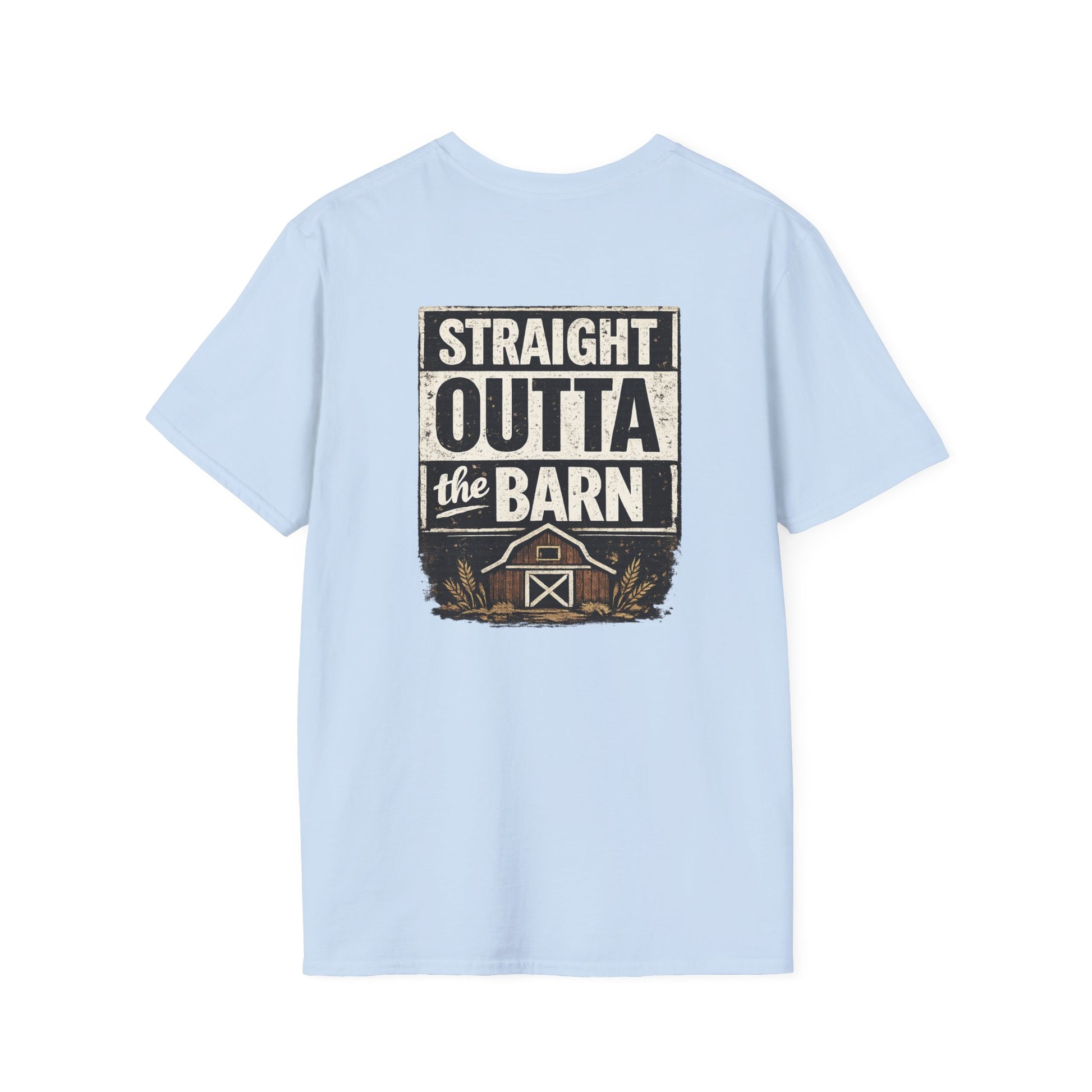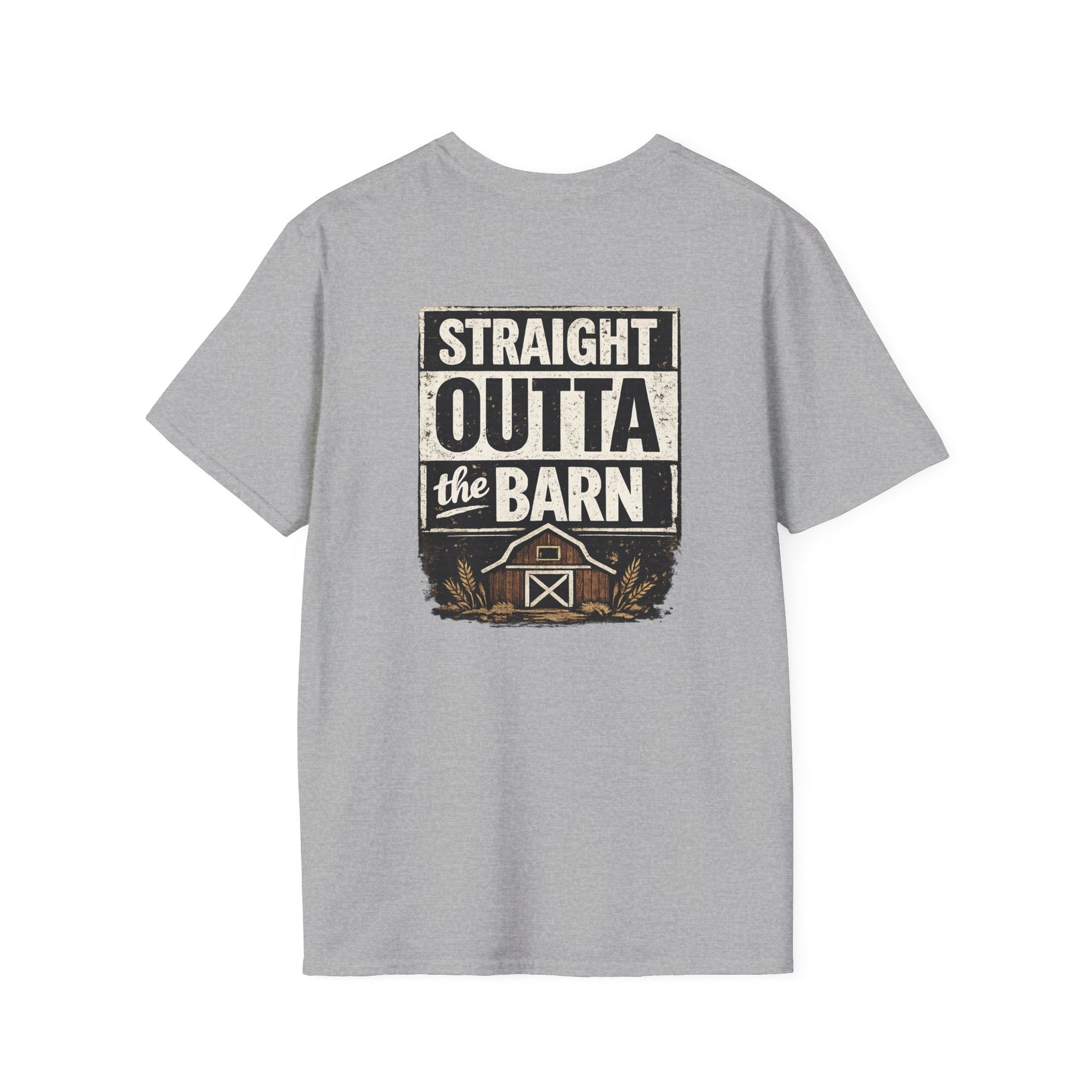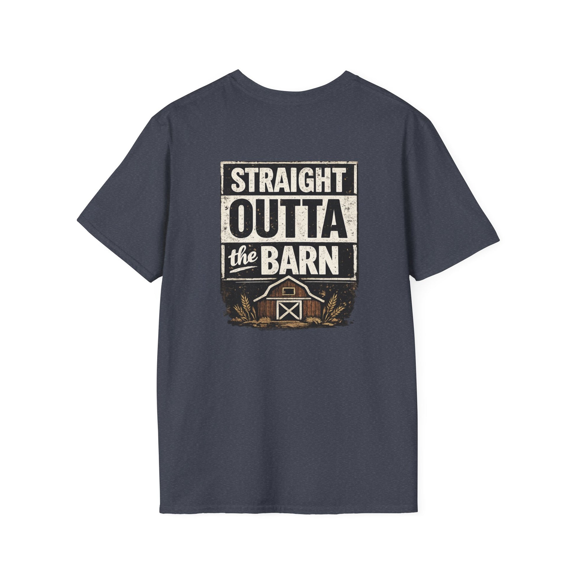 This soft, lightweight tee brings countryside pride into everyday wear. The crew-neck silhouette carries a weathered, vintage-style farm graphic on the back — bold “STRAIGHT OUTTA the BARN” lettering with a rustic barn and wheat accents — while a small coordinating emblem sits over the heart. Wear it for mornings feeding animals, weekend chores, or low-key nights at the co-op. The fabric drapes comfortably and breathes through warm days, pairing naturally with jeans, overalls, or a hoodie when the temperature dips. It feels lived-in from the first wear and balances rugged farmhouse character with clean, casual styling.
